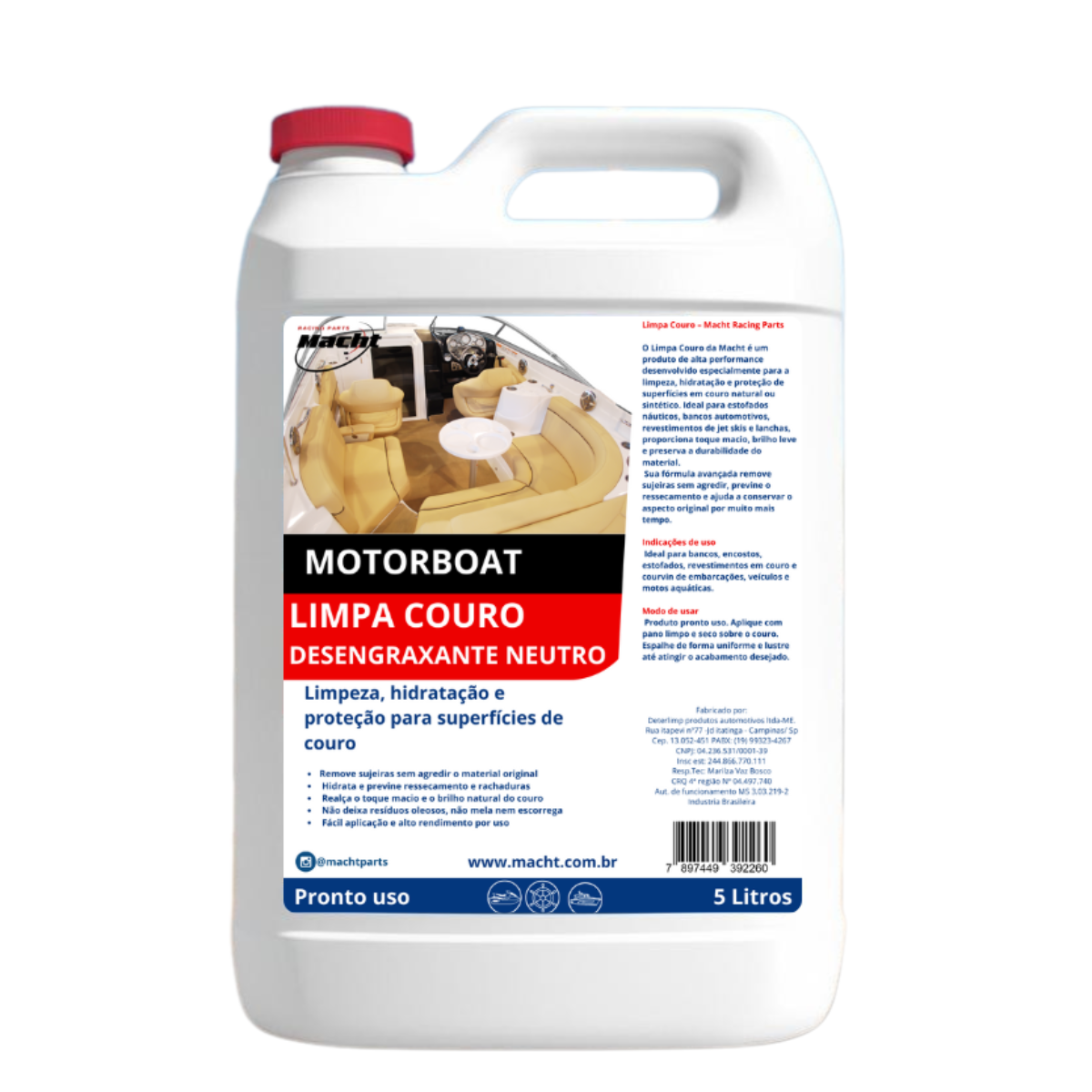 O Limpa Couro da Macht é um produto de alta performance desenvolvido especialmente para a limpeza, hidratação e proteção de superfícies em couro natural ou sintético. Ideal para estofados náuticos, bancos automotivos, revestimentos de jet skis e lanchas, proporciona toque macio, brilho leve e preserva a durabilidade do material.