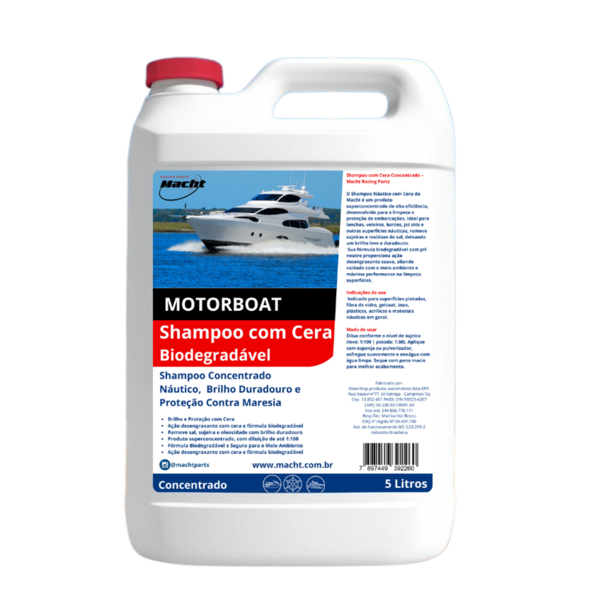 O Shampoo Náutico com Cera da Macht é um produto superconcentrado de alta eficiência, desenvolvido para a limpeza e proteção de embarcações. Ideal para lanchas, veleiros, barcos, jet skis e outras superfícies náuticas, remove sujeiras e resíduos de sal, deixando um brilho leve e duradouro.